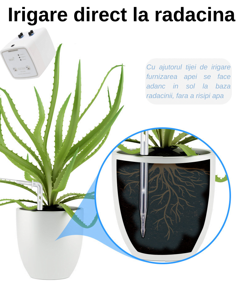 Sistemul automat de udare furnizeaza apa adanc in sol, economisind 70% apa in comparatie cu spray-ul de irigare traditional. Este suficient de portabil in dormitorul, biroul, balconul sau gradina dumneavoastra pentru udarea automata a plantelor de interior.