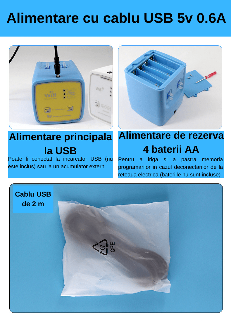 Nu trebuie sa va faceti griji cu privire la pierderea planului de udare si conectarea in retea in caz de pana de curent avand 4 bateri AA pentru pastrarea memoriei(bateriile nu sunt incluse).